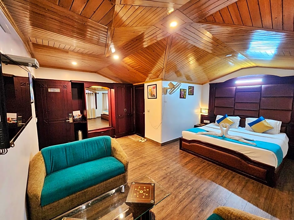This suite has a satellite TV, seating area and fireplace.